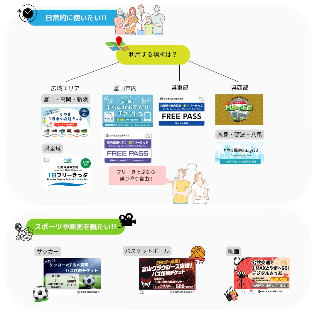 土・日・祝日限定!富山市・高岡市・射水市の複数の交通機関が1日乗り放題のお得なきっぷ。更に県内施設の割引クーポン付き。